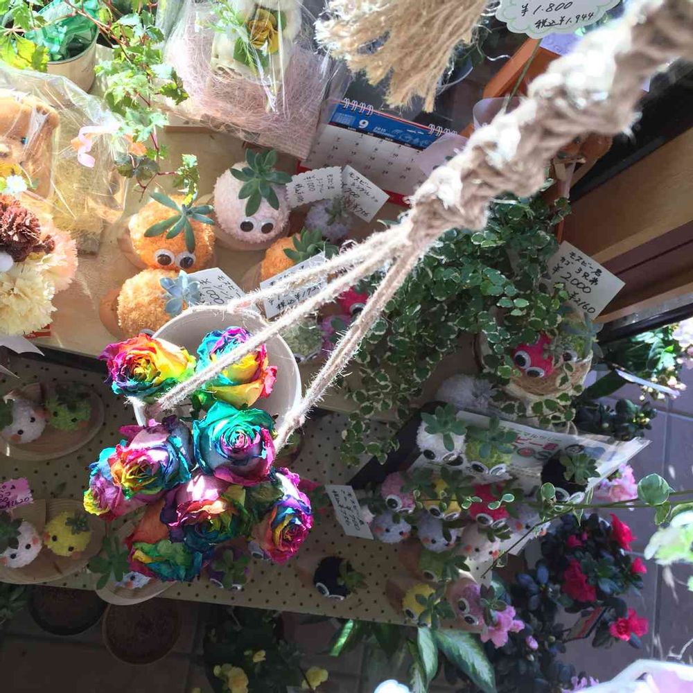 ハンギングポットにドライフラワーを飾るのもいいかもしれない。レインボーローズみたいな着色した花は高発色のドライフラワーになるのでオススメです。