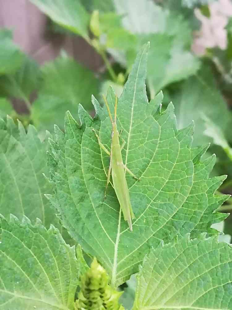 青ジソの上にお客様。お呼びはしていないのですが…