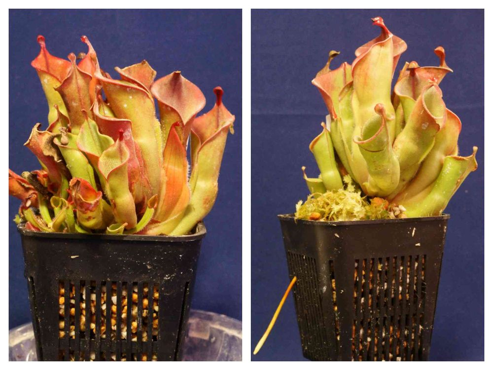 左はヘリアンフォラ ヘテロドクサ×ミノール、右はヘリアンフォラ ミノール×ヘテロドクサ。両方とも先ほどのH. イオナシと同じLEDライト下で育てていますが、あまり赤くなりません。