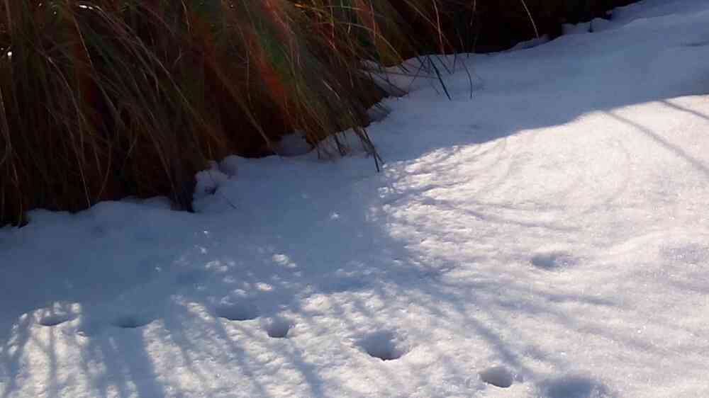 久々の実家、雪残ってました、誰かの足跡とパンパスグラス、猫かな?肉球冷たかったかなぁ