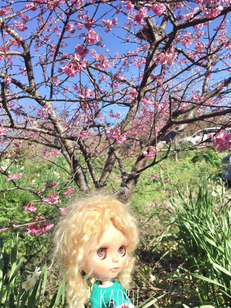 伊豆で有名な、河津桜🌸です!ブライスちゃんの頭上見て!鳥の巣がッ!怖かった~