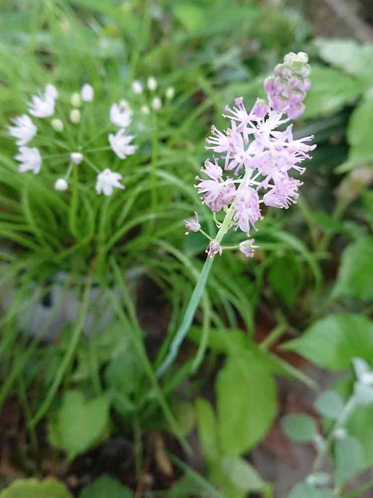 母の山野草棚から、ツルボ(手前)とイトラッキョウ(後方)💗