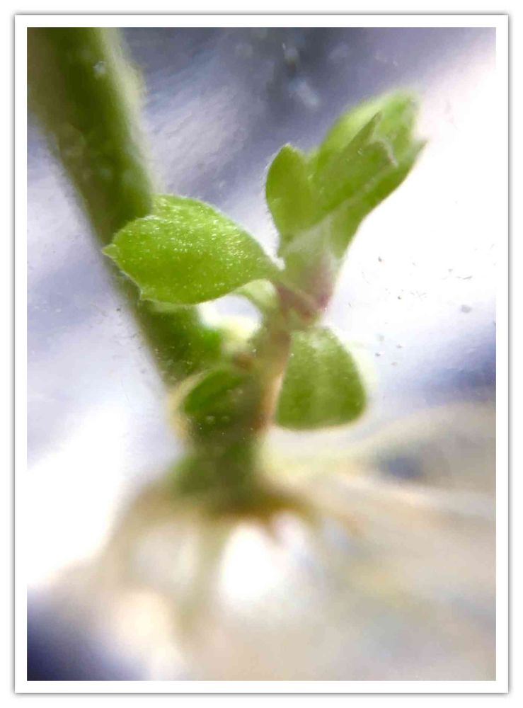 根っこ作戦中のガラス小瓶にさしたスプレーマム、根っこはどんどんモシャモシャになってきました。さらに❗️水中で新芽まで出てました🙌😆🌱