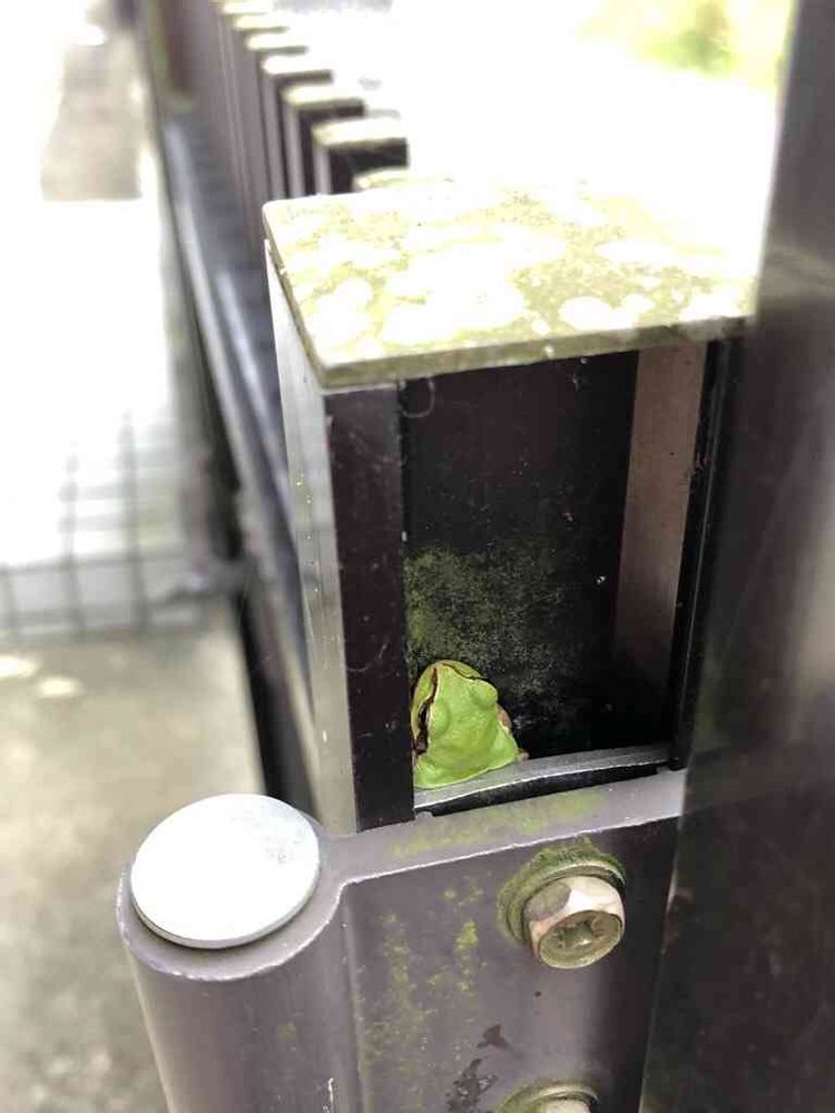アマガエルはなぜか何かに挟まってる事が多いんです。