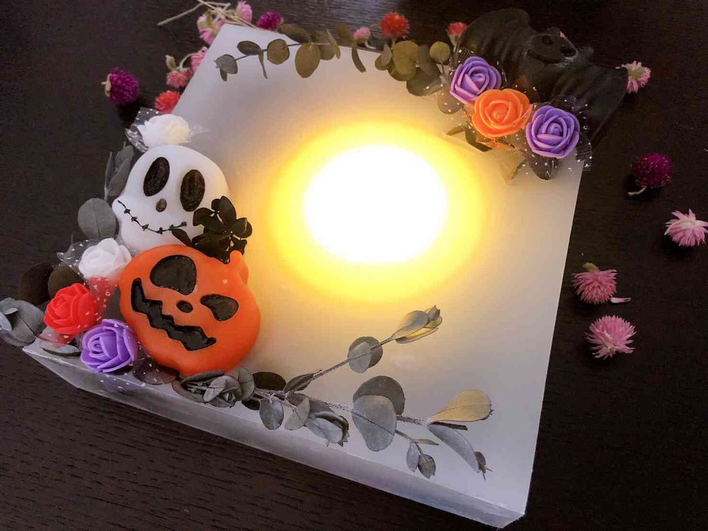 ユーカリの色味がハロウィンの雰囲気を出してくれてます♡LEDライトでお部屋、玄関を優しく照らしてくれます♡