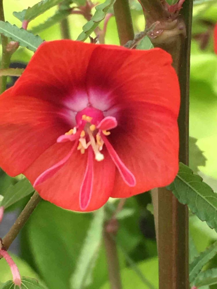葉は鋸歯があって細長く互生する花は橙色で直径4㎝ほどの両性花で夏から秋にかけて葉腋に咲く
