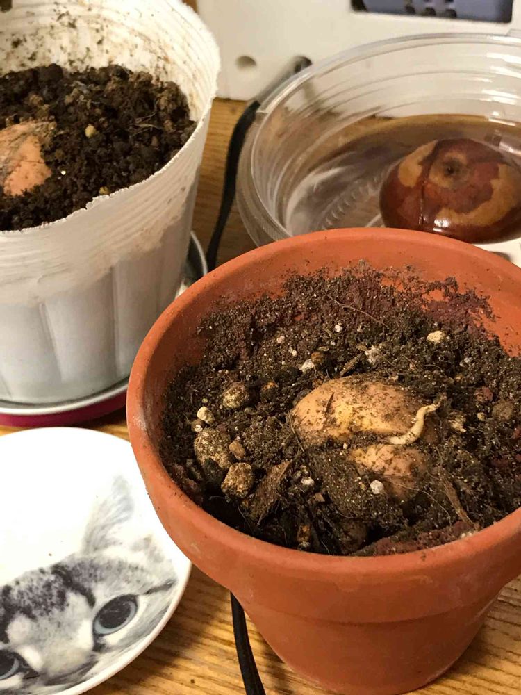 っていう手ほどきを受けて、こんどやってみたんです。根っこだとしたら、むきを整えて、水耕栽培にしたほうがよいか、土に3分の2 埋めて育てるか、調べてみます。かわいそうですものね、さかさまだと。ありがとうございます💦