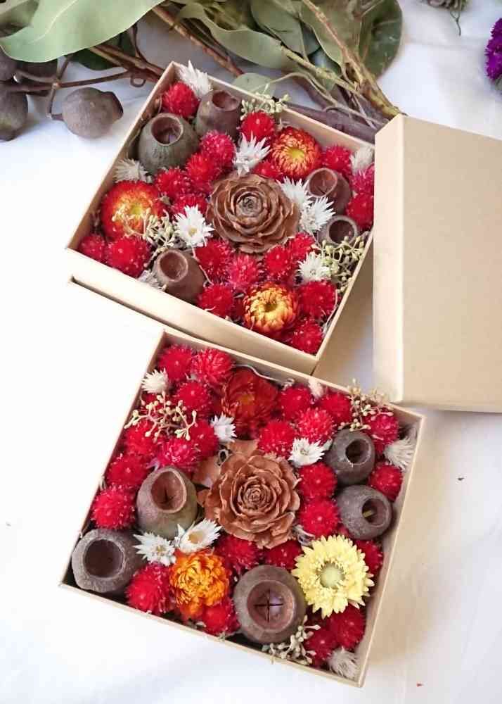 ハロウィンからクリスマス、その先のバレンタインのプレゼントに合う色の組み合わせの【センニチコウとユーカリの実】のボックスアレンジ…ではなく【ストロベリーフィールドとベルガムナッツ】のボックスアレンジ!品種名にすると美味しそうなケーキに見えるかな!