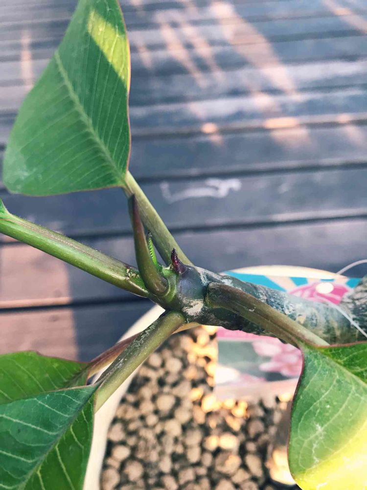 プルメリア三枝に分かれているうちの一番小さい枝の先、新葉?新芽?ずっと赤いけど緑になって葉になるのか??