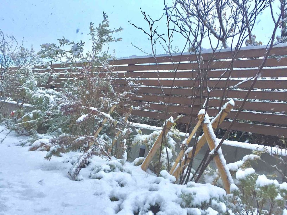 今年一年目の庭なのにこの地域で珍しく雪が降ってしまいました