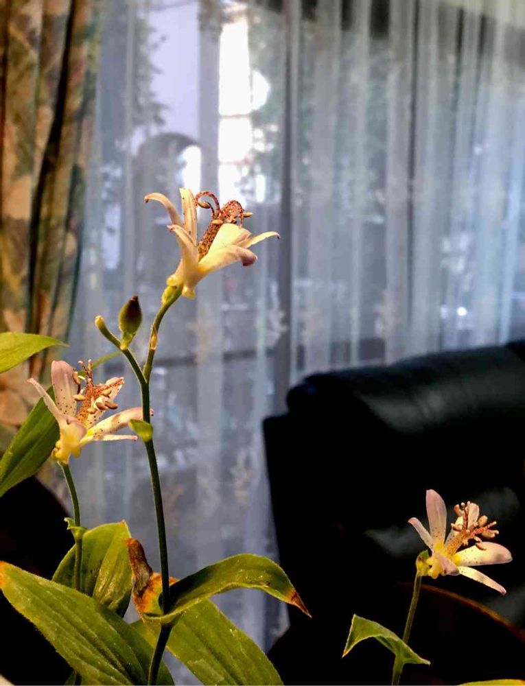 今朝は、鉢植え杜鵑草 桃里が3輪咲いてます