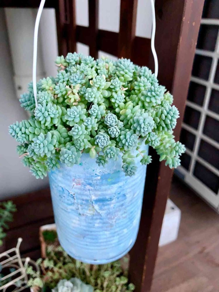 ポットからリメ缶に🥫植えたらモリモリ増えたのは季節がよかったのか?缶がよかったのか?同じ時期に素焼き鉢に植えたやつは夏に半分に減りました💧