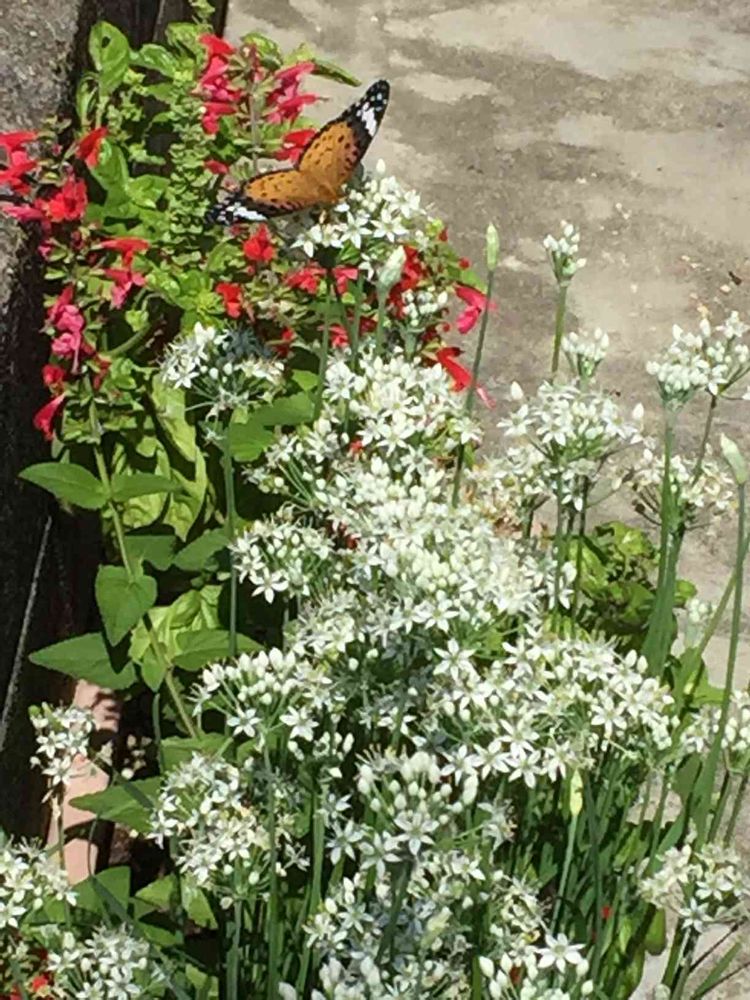 おはようございます☀ニラの花に蝶🦋が止まっていたので近寄ると、ふわりと交わされ、ずいぶんと、てこずりました一枚がこれです。なんとか、見えてますよね🦋