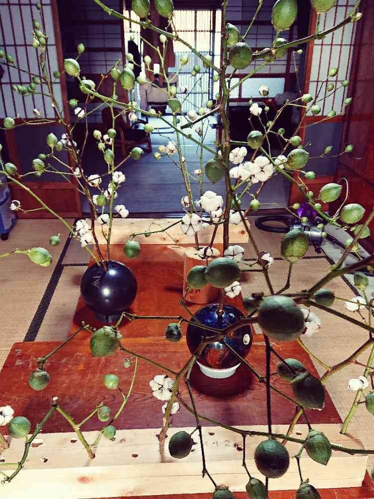 昨日実家に寄ったら座敷の部屋に収穫した綿の木が干されていた