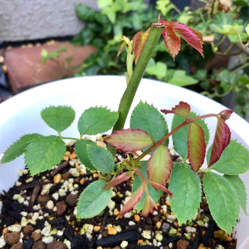 バラ(ピエール・ドゥ・ロンサール)の挿し木を3本いただき大切に育てていたのですが、写真の一本以外枯れてしまいました。この一本は葉の艶も良く新しい葉も出て来ましたがまだまだ心配です。来年の春に花が咲いた事を報告できる様に育てます。
