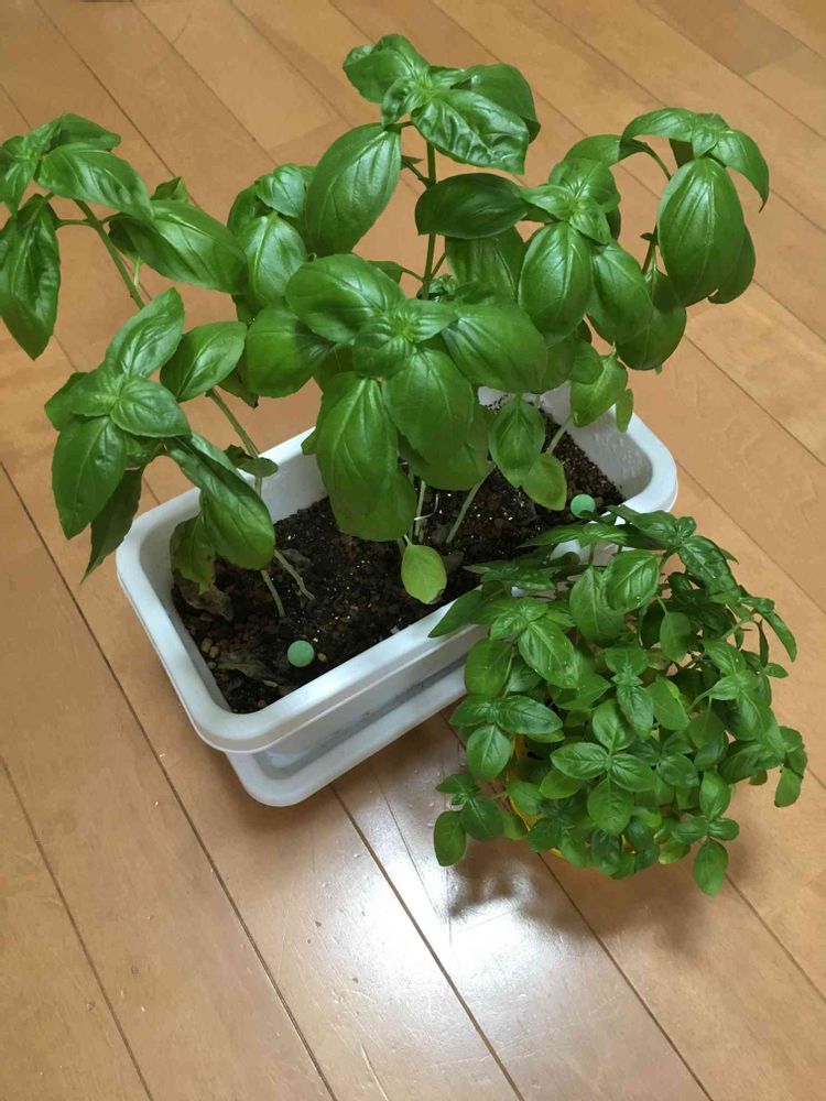 バジルです。前回投稿で伸びどまりかと思ってましたが、肥料を与えたら、まだまだ大きく育ちました!味も美味しそう!😁鉢が小さい方も毎日水切れするほど大きく育ちました。