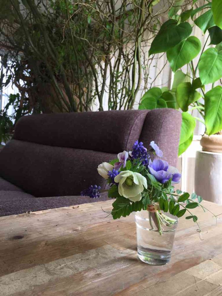 庭のアネモネ、ムスカリ、ビオラ、雑草などを束ねてみました。
