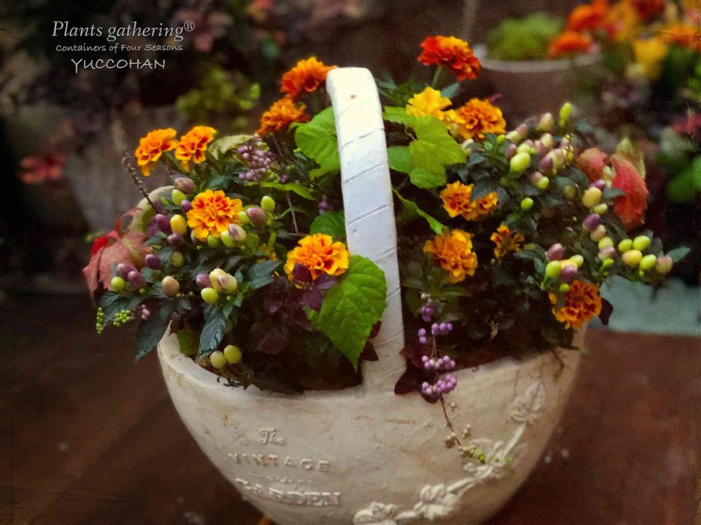 マリーゴールドのオレンジ系と実ものとの寄せ方か〜。