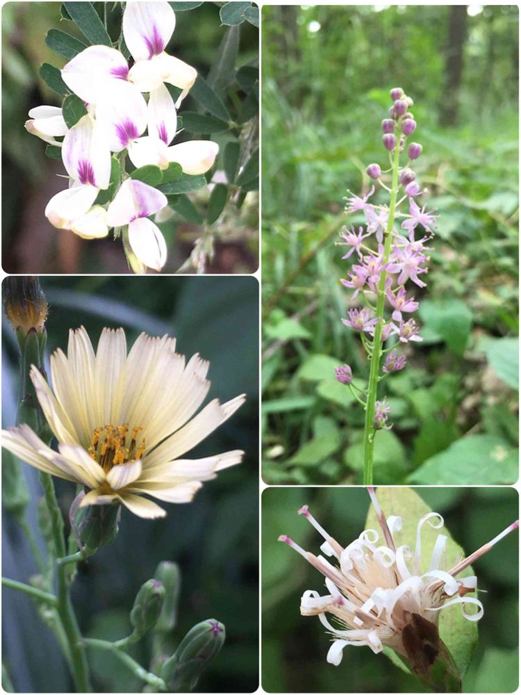市中の公園で出会った秋の花。ネコハギ、ツルボ、アキノノゲシ、コウヤボウキ。