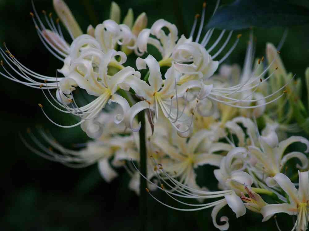 白花曼珠沙華は赤色の彼岸花と黄色の鍾馗水仙(しょうきずいせん)の自然交雑種。