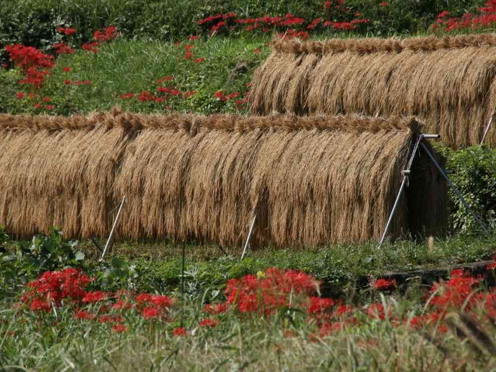 伊勢原市、日向薬師のヒガンバナと懐かしい稲🌾のはざかけ