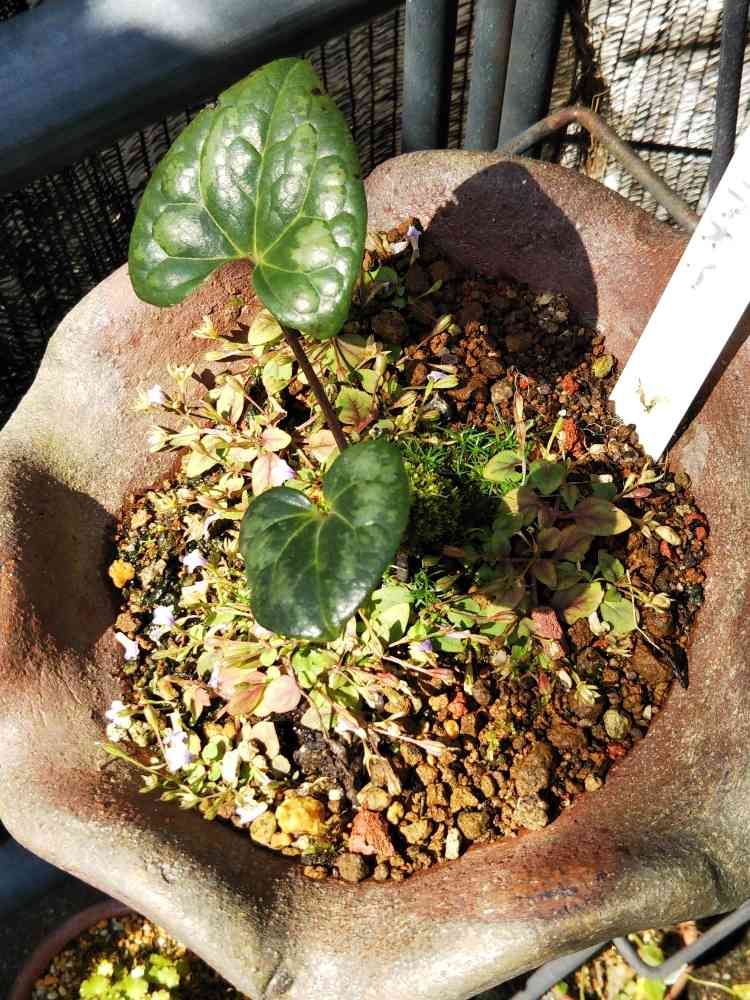 こんにちは👋😃コシノカンアオイです☺️大文字草のナメクジ枯れ葉の処理してました。ナメさん今のところいませんね😃見てなかったコシノカンアオイの鉢に、びっしりすみれ?が咲いてます😃カンアオイも気持ち良さそうです🎵