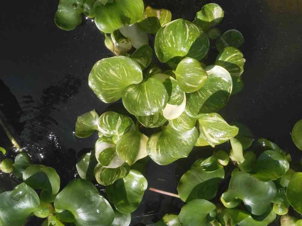 ワンシーズン越えて、ホテイアオイが、池いっぱいに増えた中に、一塊だけ、斑入りのホテイアオイがありました。