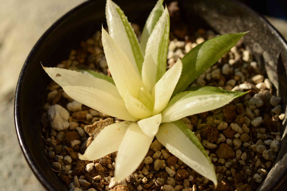 たいして斑が入っていない親株から出た綺麗に斑が入った子株を外して育てたもの。