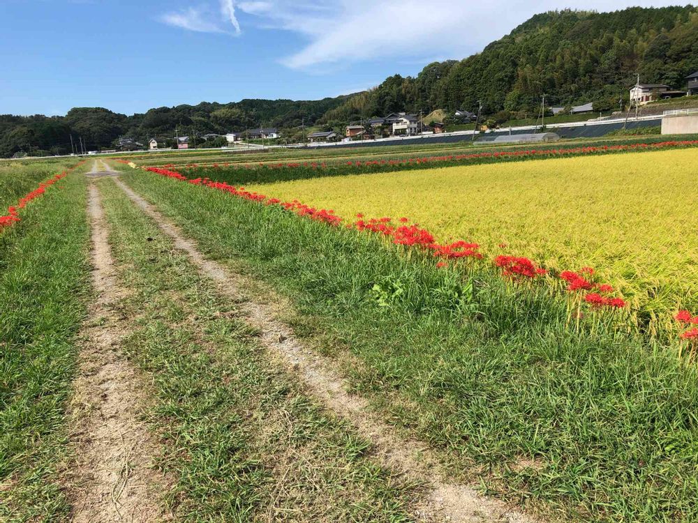 青空、黄金色の稲穂、畦道の緑、曼珠沙華の赤、山の濃い緑、それぞれが綺麗な色なので。