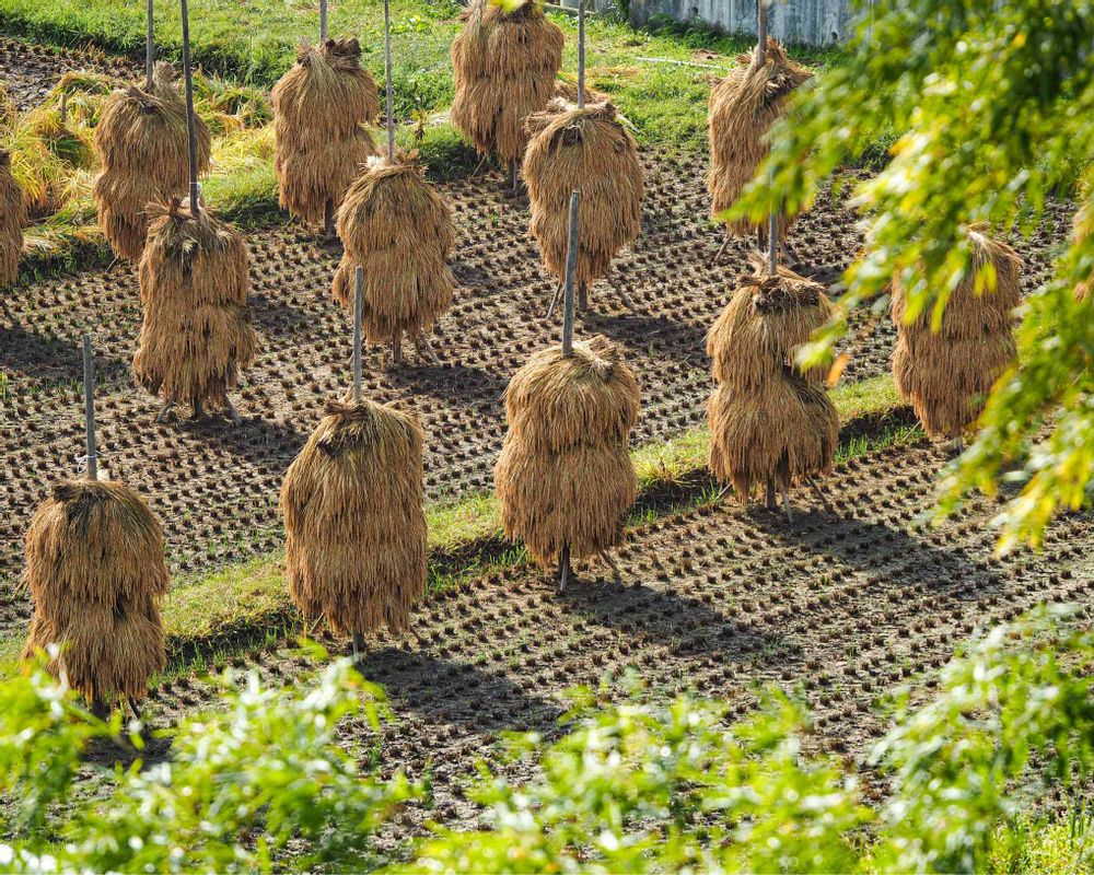 栗駒山トレッキングを終えて平泉毛越寺の近くのホテルの窓からの光景です。稲刈りが終わって稲穂が干されています。東北の方ではこのようなかたち😳