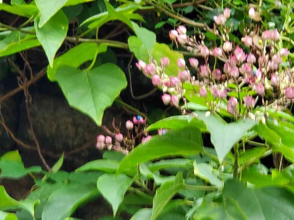 小さなピンクの花の真ん中にブルーの実か花が付いていました!