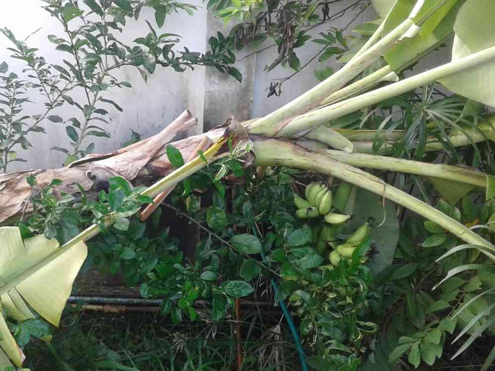 今朝起き抜けに沖縄島バナナがピンクマナオの上に倒伏しているのを発見。様子を見ると、結果大きな被害はないらしい。バナナ果実はそのまま収穫し、倒伏した株は朝から処分作業です。
