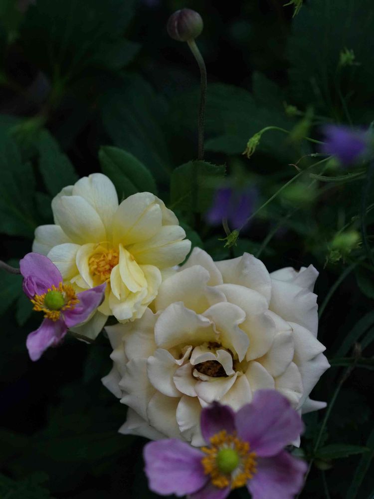 今朝はやっと咲きはじめたシュウメイギクさんとバラさんたち、エールさんとヴァネッサ・ベルさんです。