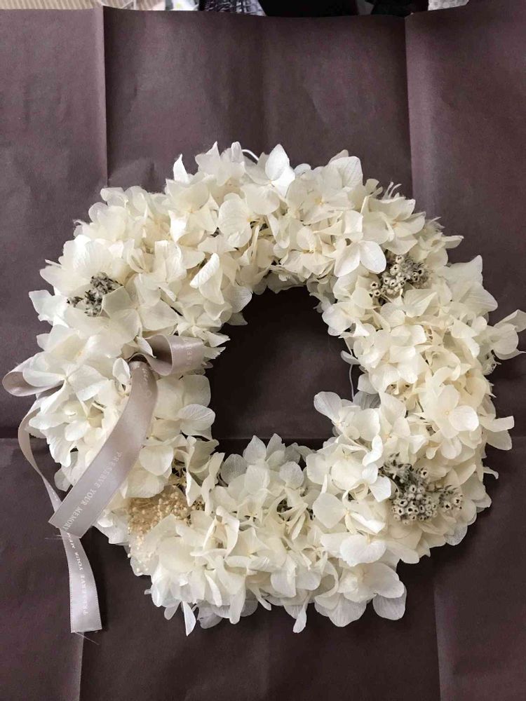 真っ白で結婚式にふさわしい、美しいリースですね!