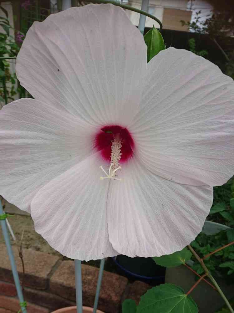 この花は、芙蓉のなかまになるのかな、おおきな花やね、上品な色合い、、真っ白、でもないよね、みごとに綺麗に咲いたね🎉🎊