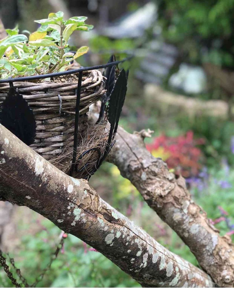 木のオブジェにカゴをかけ