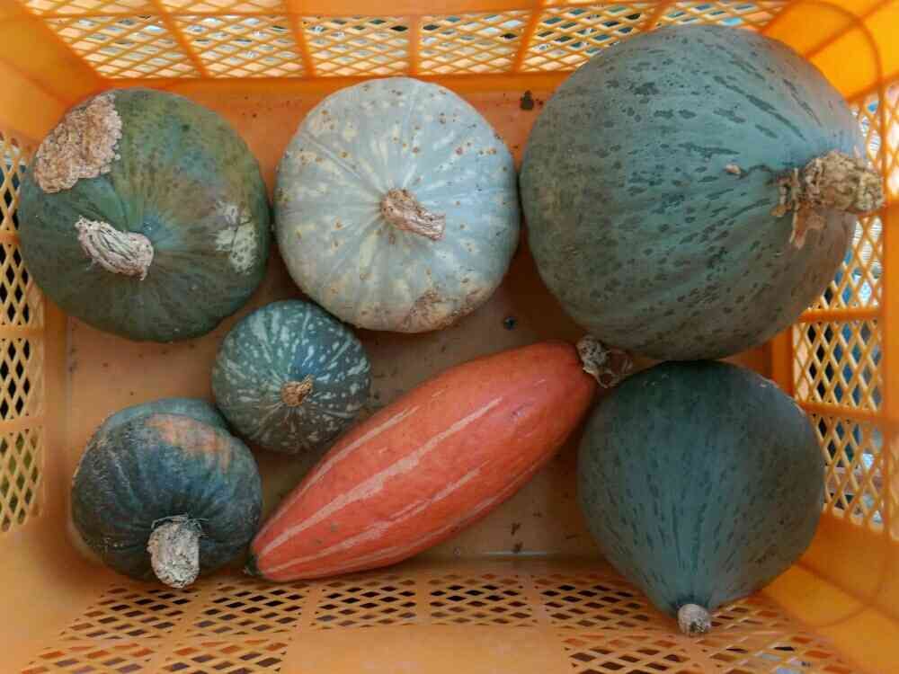 カボチャが採れました。他にも収穫前のカボチャが、これの倍くらい畑に残ってますがカボチャの品種は分かりません。ヤフオクで種を落札したのですが出品してた人がオレンジの皮のカボチャ、ラグビーボールみたいな形をしたカボチャ、オマケとして白い皮のカボチャを付けますという風に見た目でカボチャを区別してたからです。