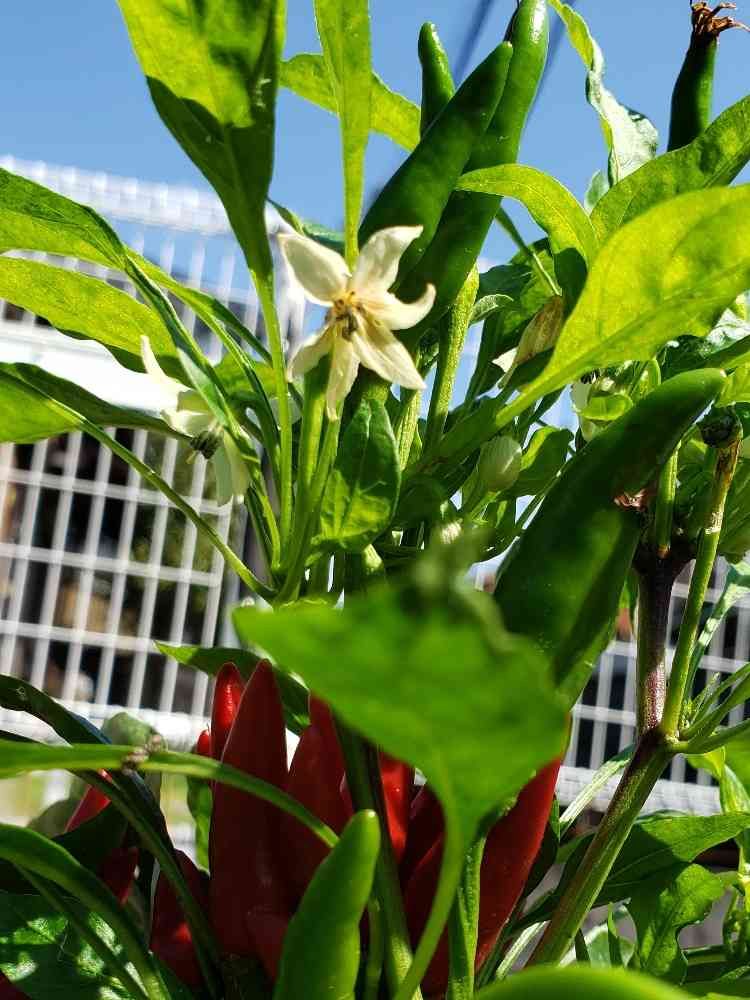 わかる?唐辛子の花と熟した🌶️と出来立ての青い唐辛子。