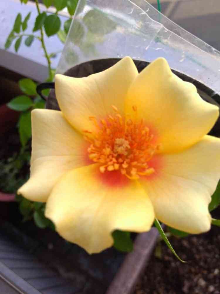 babyeyesという品種のバラだそうです。初めてうちのベランダで咲きました。赤い実が付きますが、食べてはいけないようなので、ドライにして飾りに使おうかと思っています。