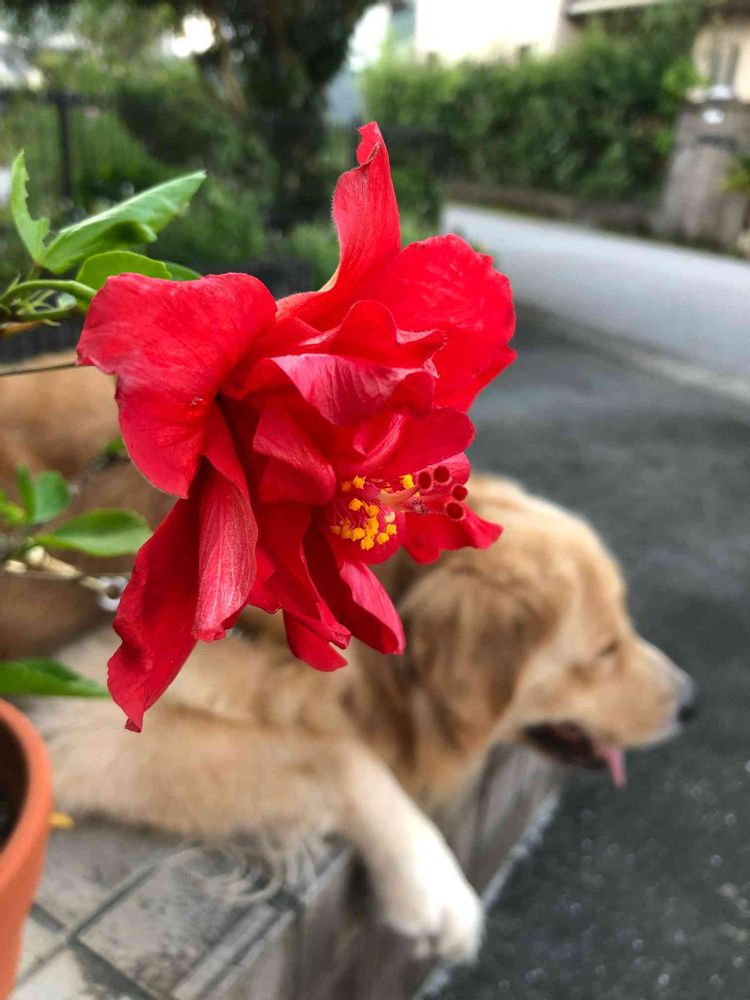 朝んぽの後、ハイビスカス🌺と愛犬^_^