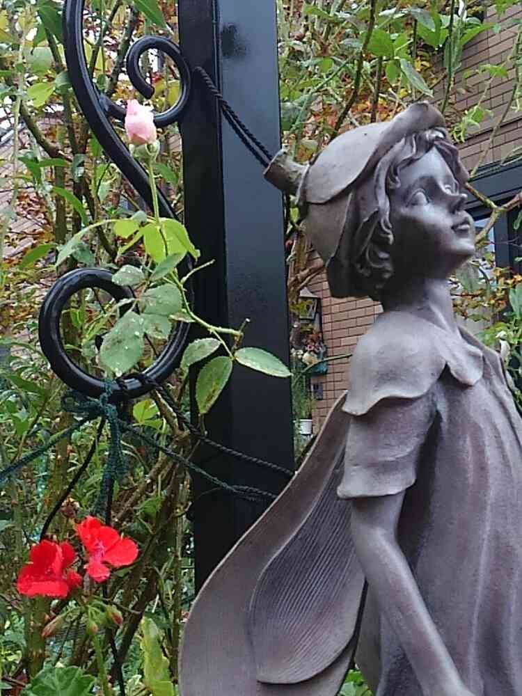 真っ赤なゼラニウムとピンクの薔薇、フェアリーちゃんはどちらにも背を向けるのね⁉これを見ている貴方はどちらがお好みですか❔