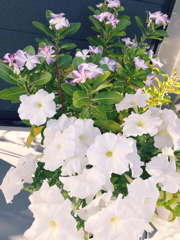 寄せ植えのペチュニアとニチニチソウは今日も元気😄