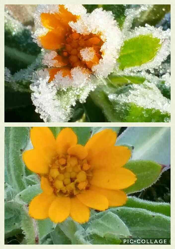 霜が降りた朝の冬知らずのお花💠と昼間のお顔