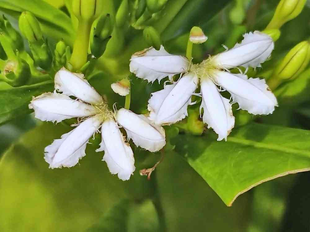 葉の合間に咲いてる小さな白い🌼…花弁は5つですが、半分に切ったように下側・扇状に開きます😆