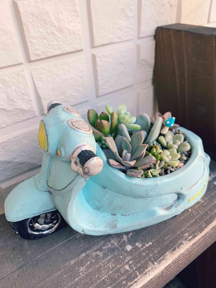可愛いバイクの鉢が売っていたので、多肉ちゃんの寄せ植えを作って見ました😊