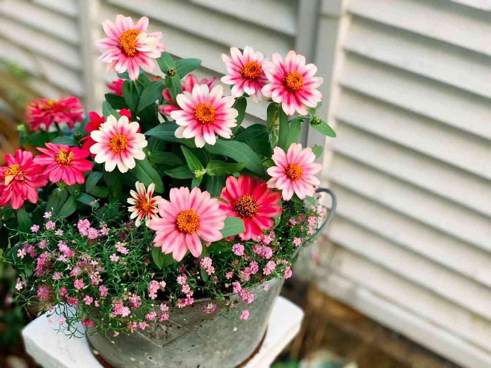 ピンクのジニアとカスミ草の寄せ植え、とっても可愛いです😉💝💝