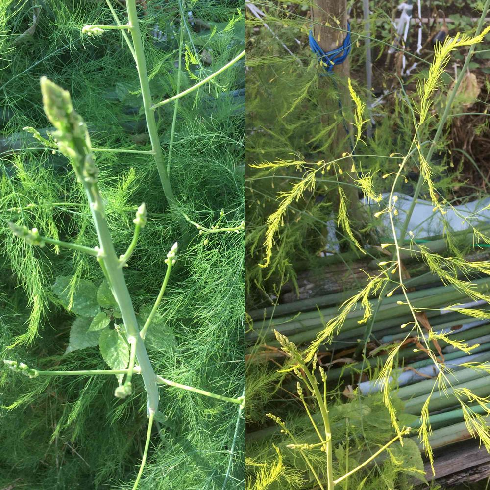 アスパラガスの花が咲いてます。食べれるアスパラガスも一本咲いてました。