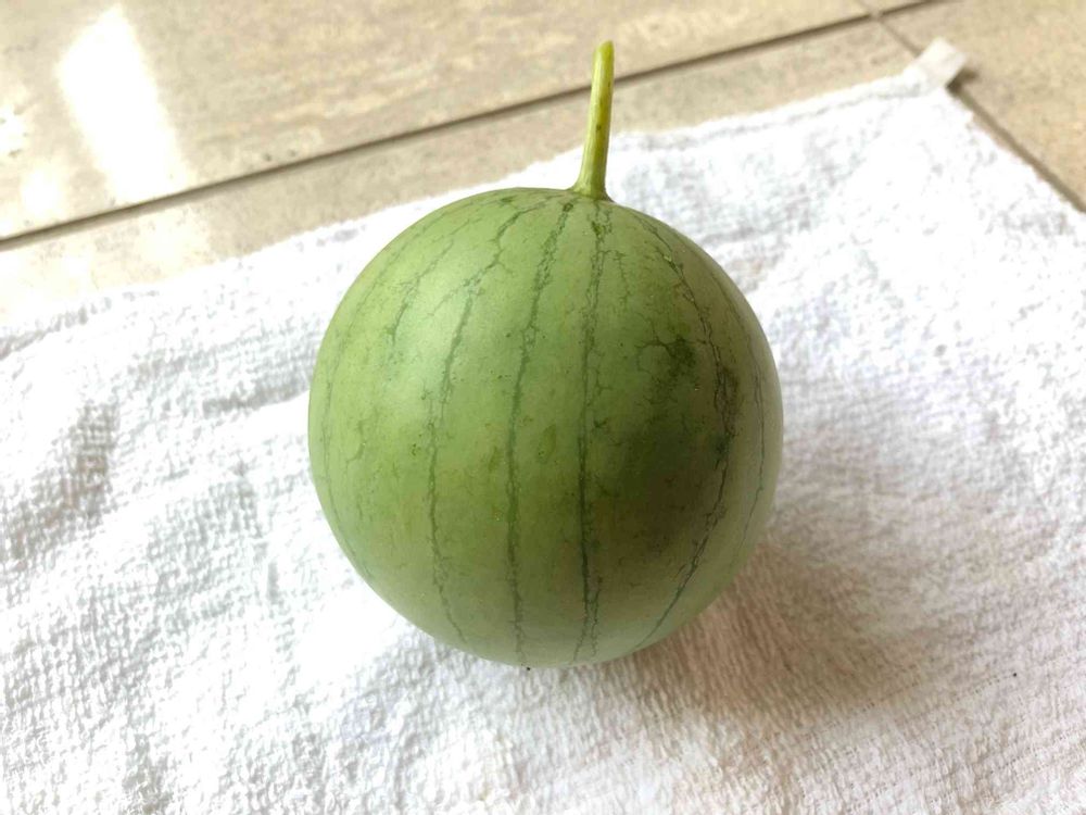 そして9月26日収穫。ソフトボールくらい大きくなりました。もう少し大きくなれと思っていたけど、つるが枯れてきたので、収穫しました。