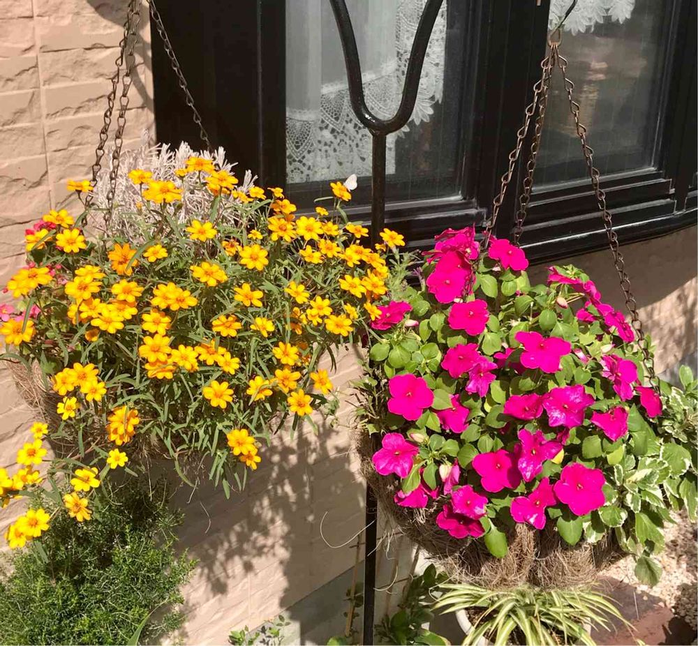 昨日投稿した横のハンギングにはインパチェンスが広がってます。ジニアがかなり迫って来て…。