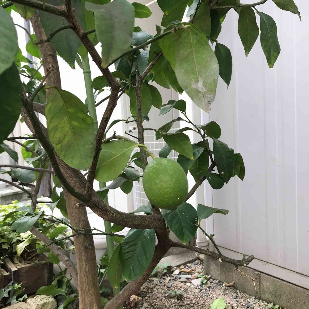 裏庭のレモン、梅雨の大雨で全滅と思っていたけれど、なんと下の方に1つ実っていましたーー‼️苦節9年目の初レモン🍋✨